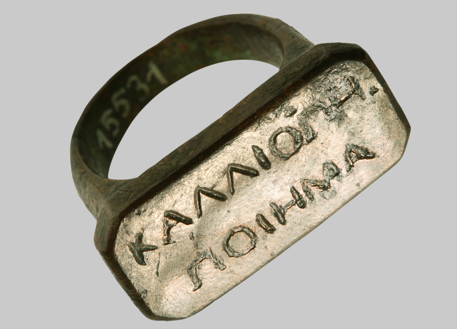 Breiter, im Querschnitt rechteckiger Reif, der sich auf der Vorderseite weiter verbreitert. Die langrechteckige Platte (1,35 x 2,7 cm) mit abgeschrägten Ecken steht über den Durchmesser des Reifs hinaus. Auf der Platte die griechische Inschrift: ΚΑΛΛΙΟΠΗ ΠΟΙΗΜΑ („Werk der Kalliope“).
