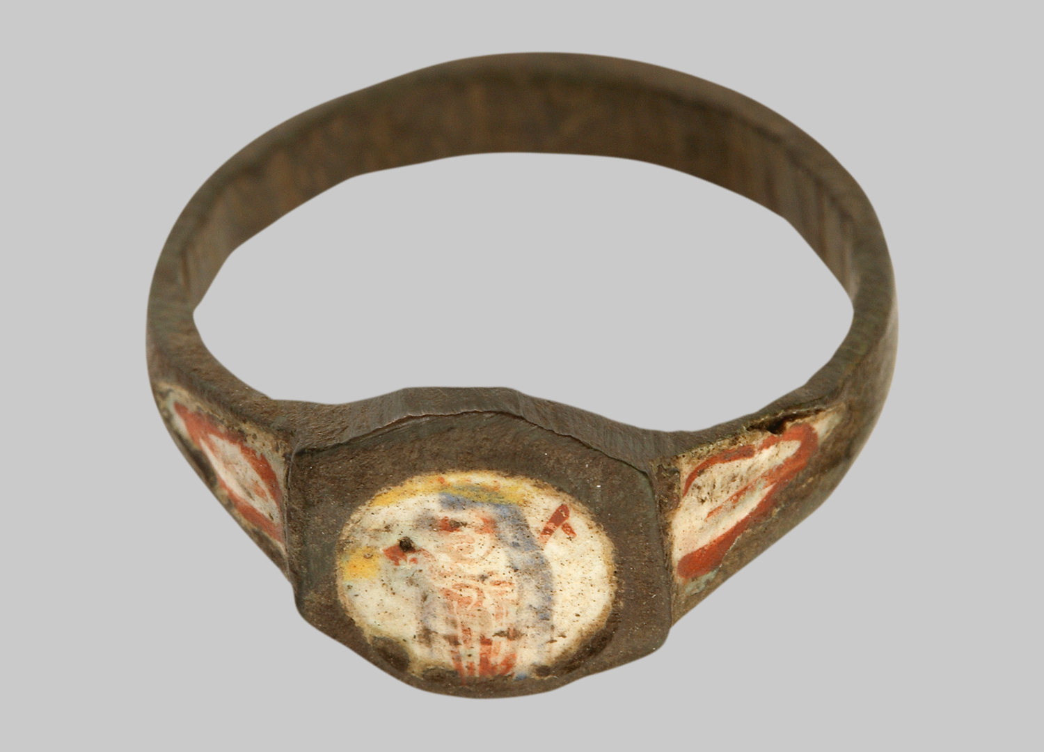 Bandförmiger Reif, der sich zu einer achteckigen Ringplatte verbreitert. Auf den Schultern je ein dreieckiges Emailfeld mit weißer Füllung und roter Verzierung. In der Ringplatte (Dm 0,8 cm) eine runde Emaileinlage: weißer Hintergrund mit Dekor in blau, rot und gelb. Bei der Detailansicht der Ringplatte kann man anhand der roten Linien eine Figur mit blauem Mantel und gelbem Kopfumriss sowie eine rote Linie im Kopfbereich erkennen. Es scheint, als ob die Figur ein Kind auf ihrer rechten Seite hält. Im Kopfbereich des Kindes ist auch ein gelber Umriss sichtbar. Hinter der linken Schulter der zentralen Figur ist eine rote schräge Linie zu sehen. Wahrscheinlich handelt es sich um eine Abbildung Marias mit dem Jesuskind. Der Reif ist von innen sehr flüchtig bearbeitet.