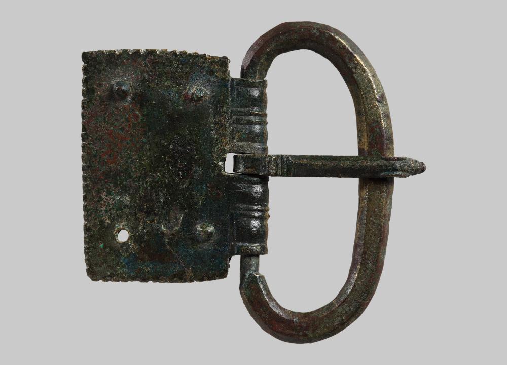 Gürtelschnalle mit D-förmigem Bügel und rechteckigem Blechbeschlag.