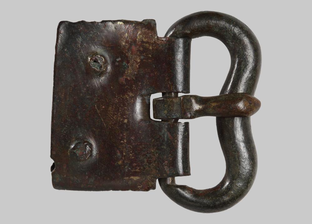 Gürtelschnalle mit nierenförmigem Bügel und rechteckigem Blechbeschlag.