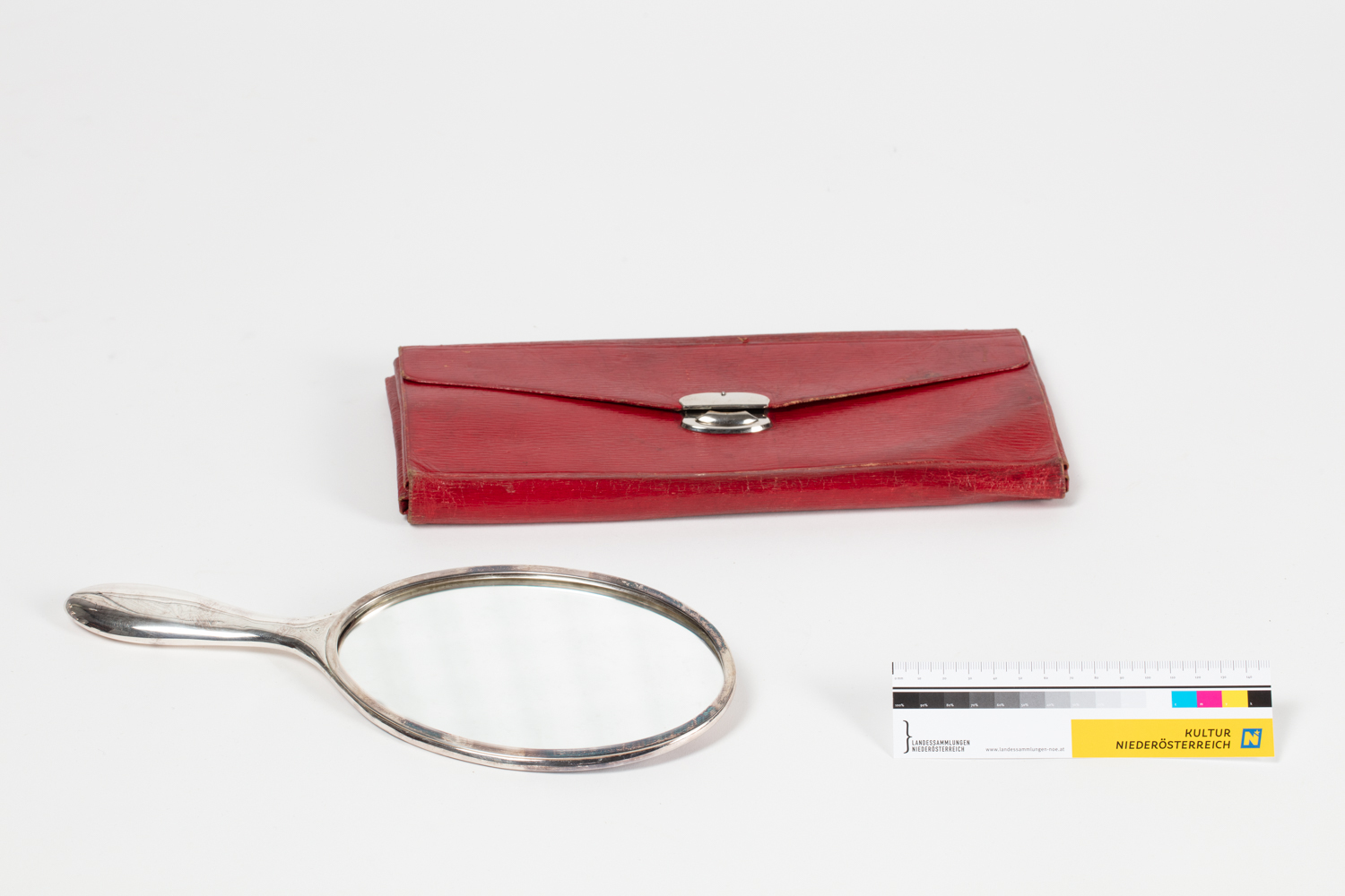 ein querrechteckiges Etui mit Mappenschloss aus vernickeltem Messing, außen mit geprägtem und rot lackiertem Ziegenspaltleder bezogen, innen mit braunem Rehleder gepolstert, ausklappbare Fächer für zwei Handspiegel (ein Spiegel fehlt), Handspiegel aus Silber, auf der Spiegelfassung Chiffre S mit Herzogshut