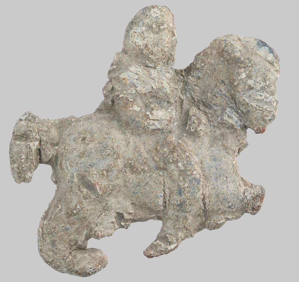 Ein Votiv des Mithras. Er sitzt auf einem Pferd und reitet nach rechts. Die Körperzüge sind nur schwach ausgeprägt. Der Kopf ist frontal dargestellt, während der Körper mit rechtem Arm und rechtem Bein im Profil erscheint. Er trägt eine phrygische Mütze. Der rechte Arm ist abgewinkelt und hält die Zügel. Der Mantel fällt nach hinten. Das Pferd bewegt sich im Trab. Seine Beine sind teilweise abgebrochen. Die Rückseite ist flach ausgearbeitet.