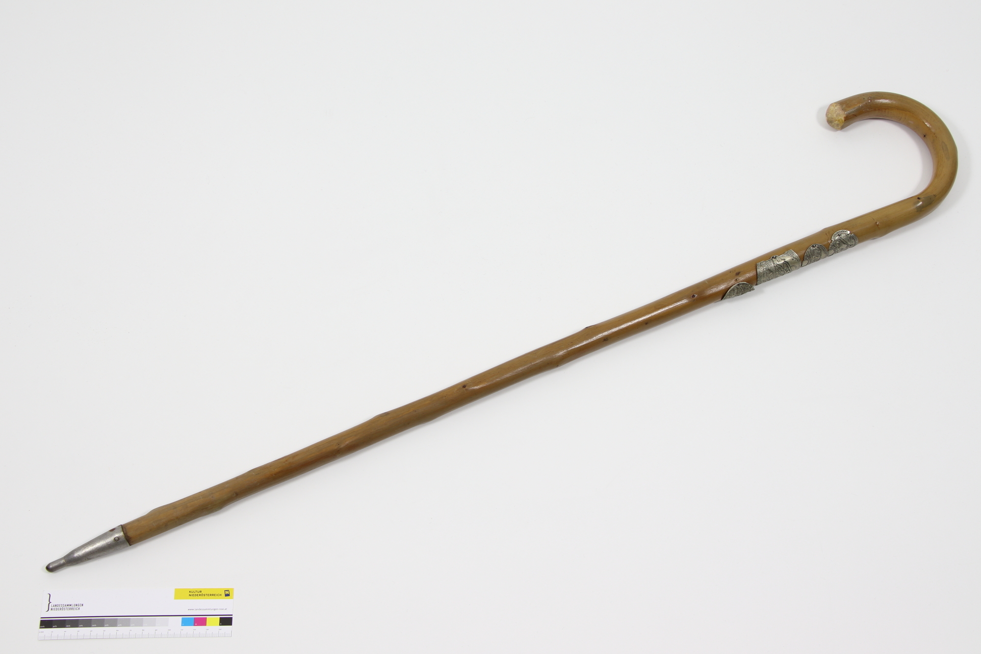 Brauner Wanderstock mit rundem Griff und goßer Schutzkappe mit abgerundeter Spitze. Vier Bild-Plaketten sind am Stock festgenagelt.