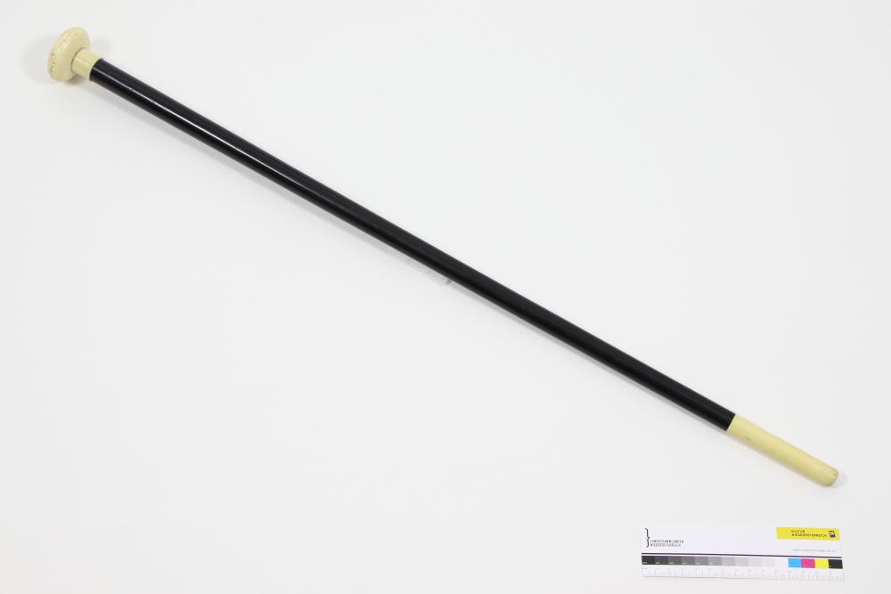 Schwarzer Gehstock mit rundem Knauf und Spitze aus Bein. Auf der Oberseite vom Knauf ist ein Zirkel in schwarz eingraviert.