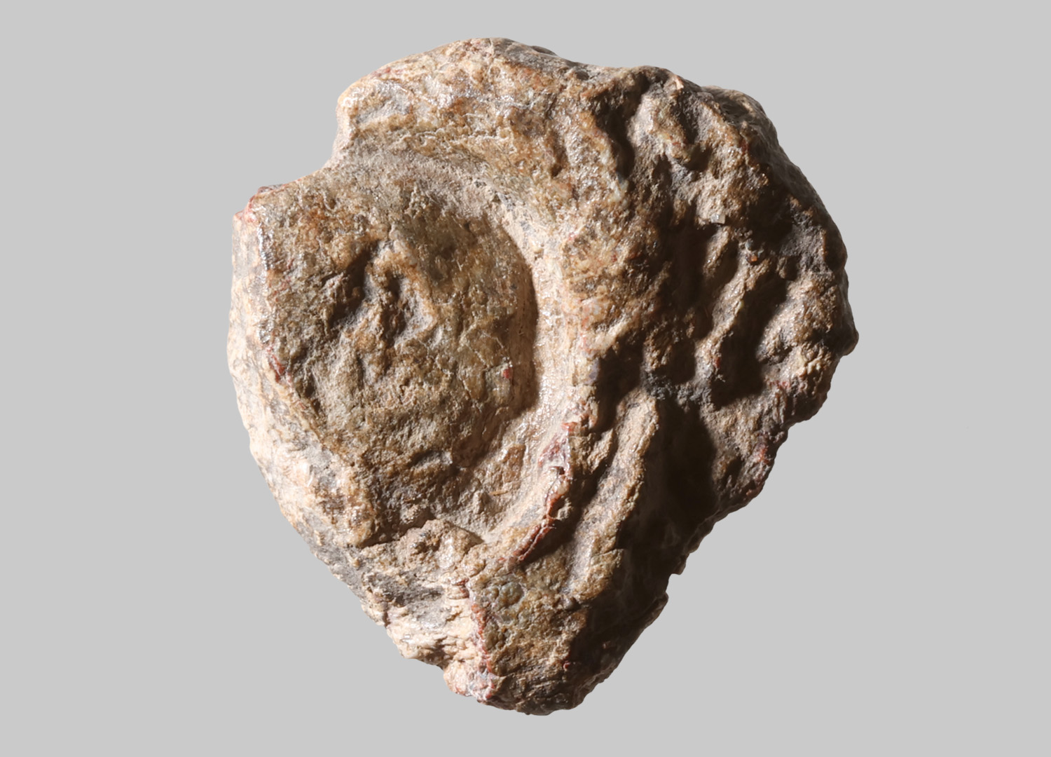 Unförmige Plombe mit rundem Stempel; ein männlicher fülliger Kopf im Profil erkennbar, nach rechts blickend; Stempelung schwach ausgeprägt; diagonale Durchlochung