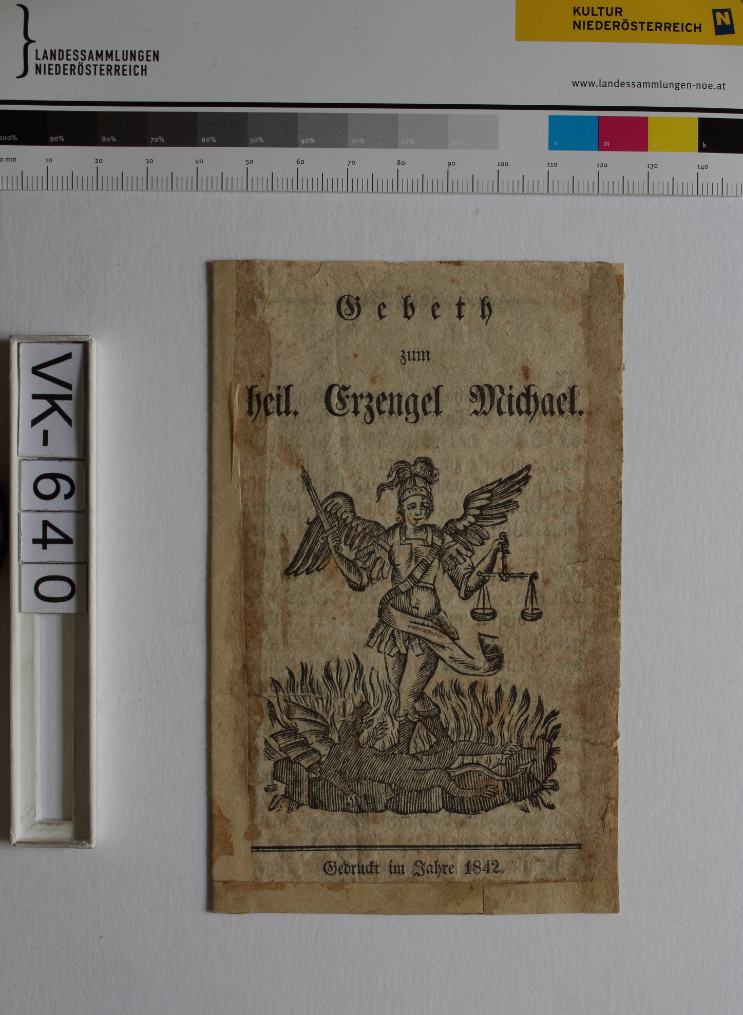 St. Michaelfragen; 1 Blatt, gefaltet: "Gebeth zum heil. Erzengel Michael", "Gedruckt im Jahre 1842", handschriftlich "Langenlois 1895", Abbildung: Erzengel Michael mit Schwert, Waage und Hölle; Eintrag Inventarbuch: "St. Michaelfragen, Waldviertel S K"