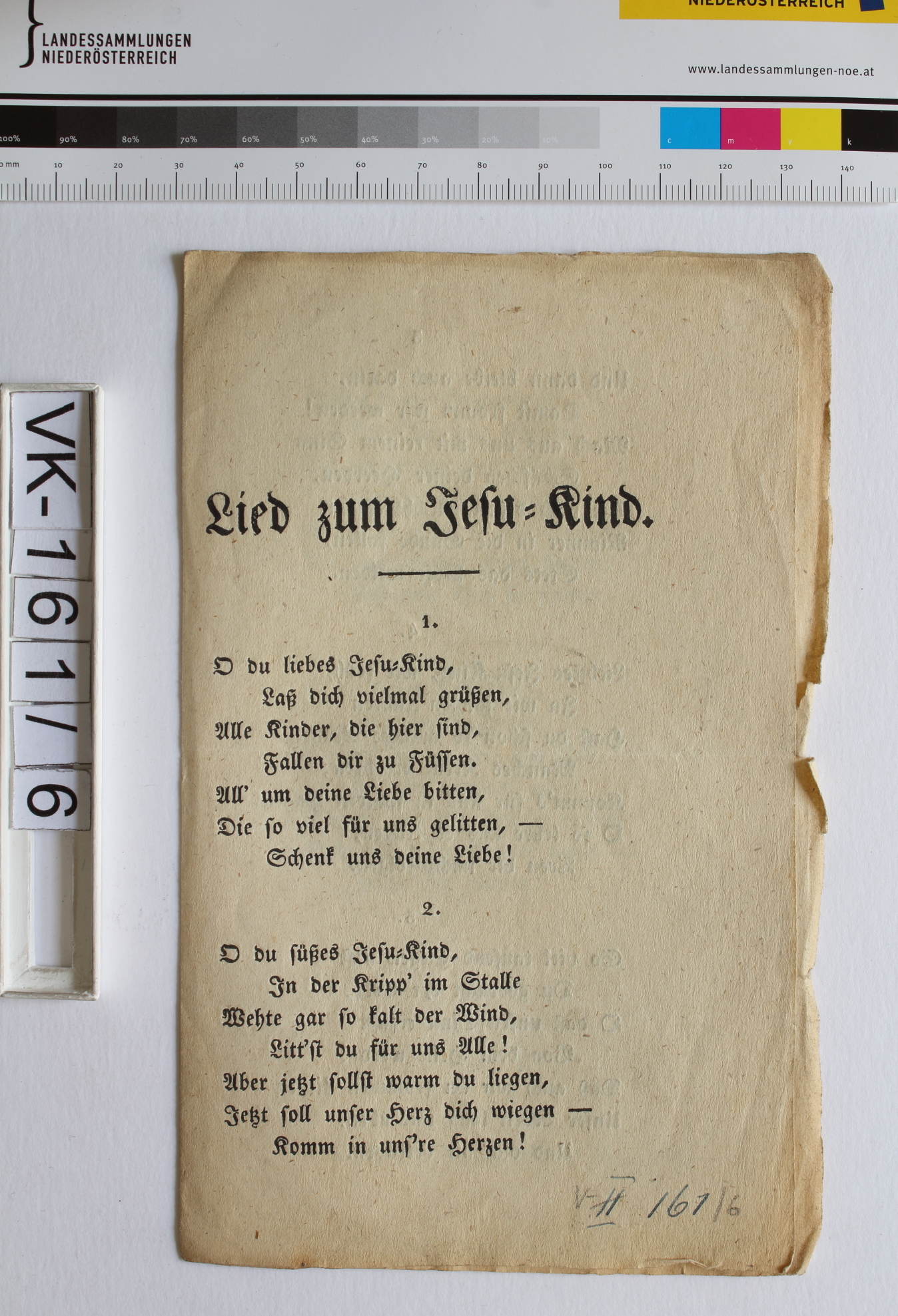 Lieder zu Jesus; 1 Blatt, gefaltet: "Lied zum Jesu=Kind", "Druck von J. Schmid in Linz 1853"; Eintrag Inventarbuch: "Lieder zu Jesus etc. (in einem Umschlag"