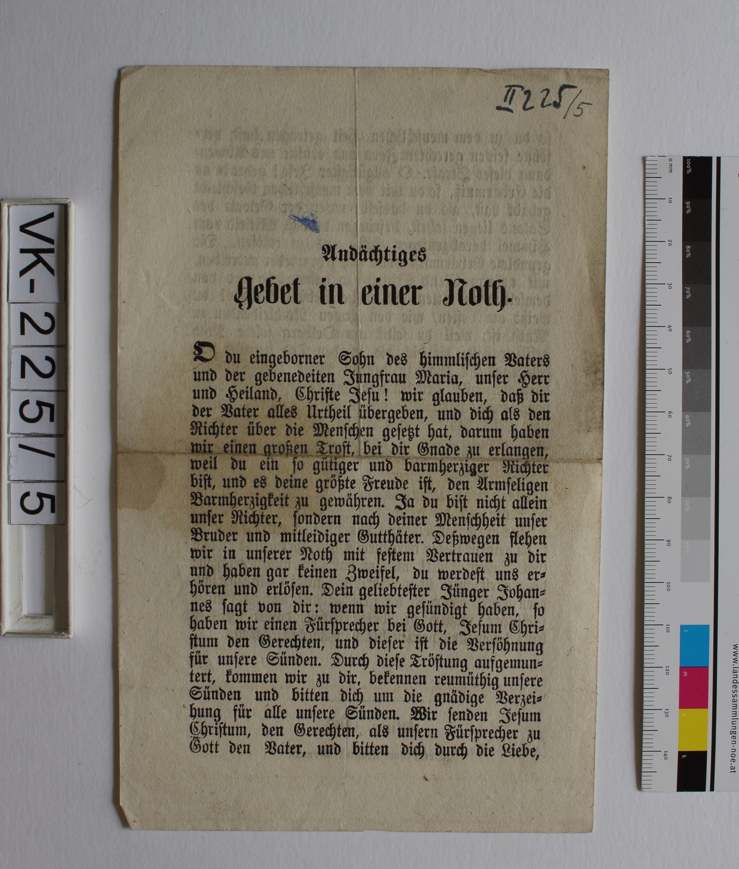 1 Blatt: "Andächtiges Gebet in einer Noth", "Wien, 1860. Druck von Leopold Grund"; Eintrag Inventarbuch: "verschiedene Gebete"