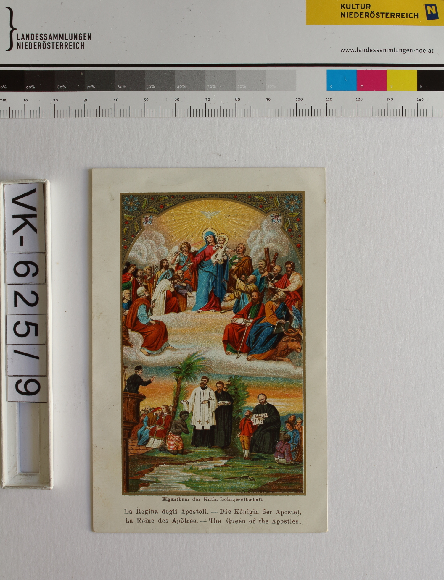 Primiz- und Jubelfeier; Vorderseite: Maria mit Kind umgeben von Apolsteln; Priester predigt von der Kanzel; Taufe eines Jungen; Missionierung (Pater mit Buch, umringt von Menschen, "La Regina degli Apostoli - Die Königin der Apostel."; Rückseite: "Andenken an die im Jahre 1893 geweihten Priester der Katholischen Lehrgesellschaft" (14 verschiedene Namen angeführt); Eintrag Inventarbuch: "Primiz- und Jubelfeiern, Bilder"