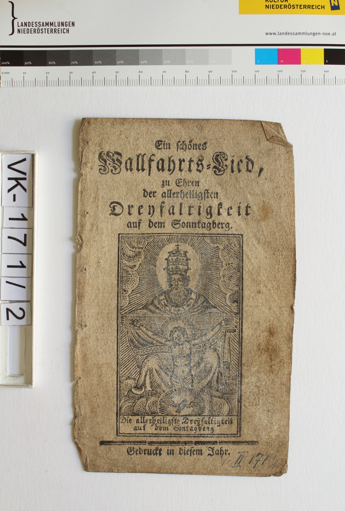 Sonntagberg; 1 Blatt, gefaltet: "Ein schönes Wallfahrts=Lied, zu Ehren der allerheiligsten Dreyfaltigkeit auf dem Sonntagberg", "gedruckt in diesem Jahr", Abbildung: Gnadenbild = Gnadenstuhl "Die allerheiligste Dreyfaltigkeit auf dem Sontagberg"; Eintrag Inventarbuch: Wallfahrtslieder zum Sonntagberg (10. Jänner 1991)"