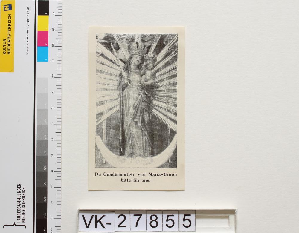 Mariabrunn in Wien-Penzing; Vorderseite: Gnadenstatue = Maria mit Kind, "Du Gnadenmutter von Maria-Brunn bitte für uns"; Rückseite: Gebet, "Photo: Dr. Hermann Schießl"