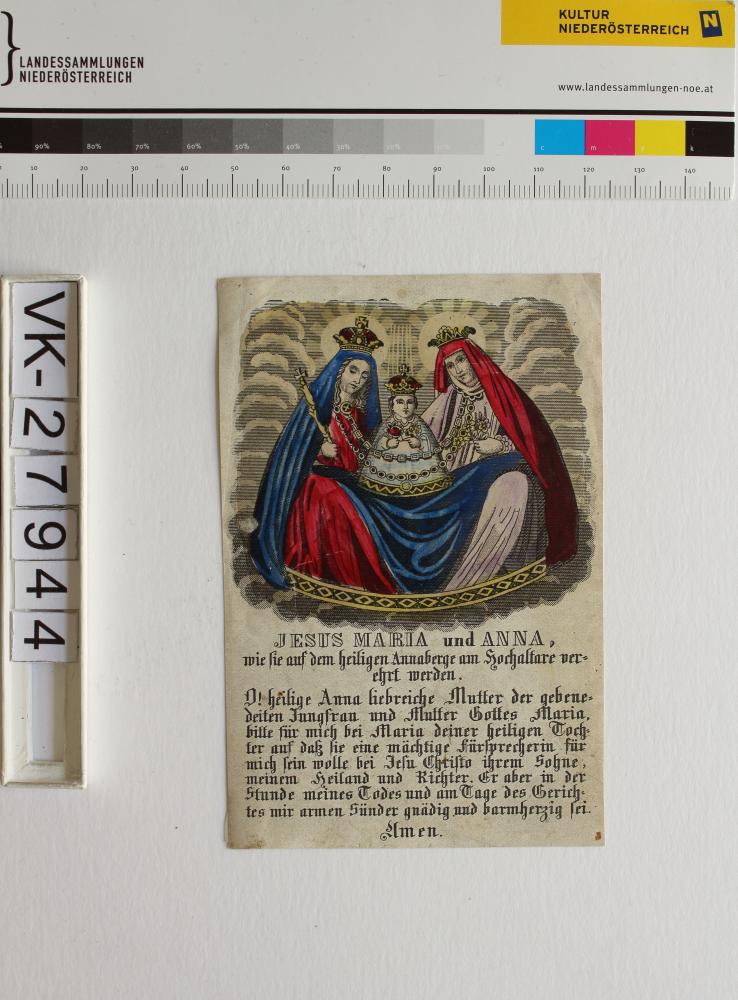 Annarotte, Annaberg, St. Anna Wallfahrtskirche; Vorderseite: Gnadenstatue = Anna Selbtritt = Anna Maria Jesus, Wallfahrtskirche, Blumen (Rosen), "Jesus, Maria und Anna wie sie auf dem heil. Annaberge auf dem Hochaltare verehrt werden"