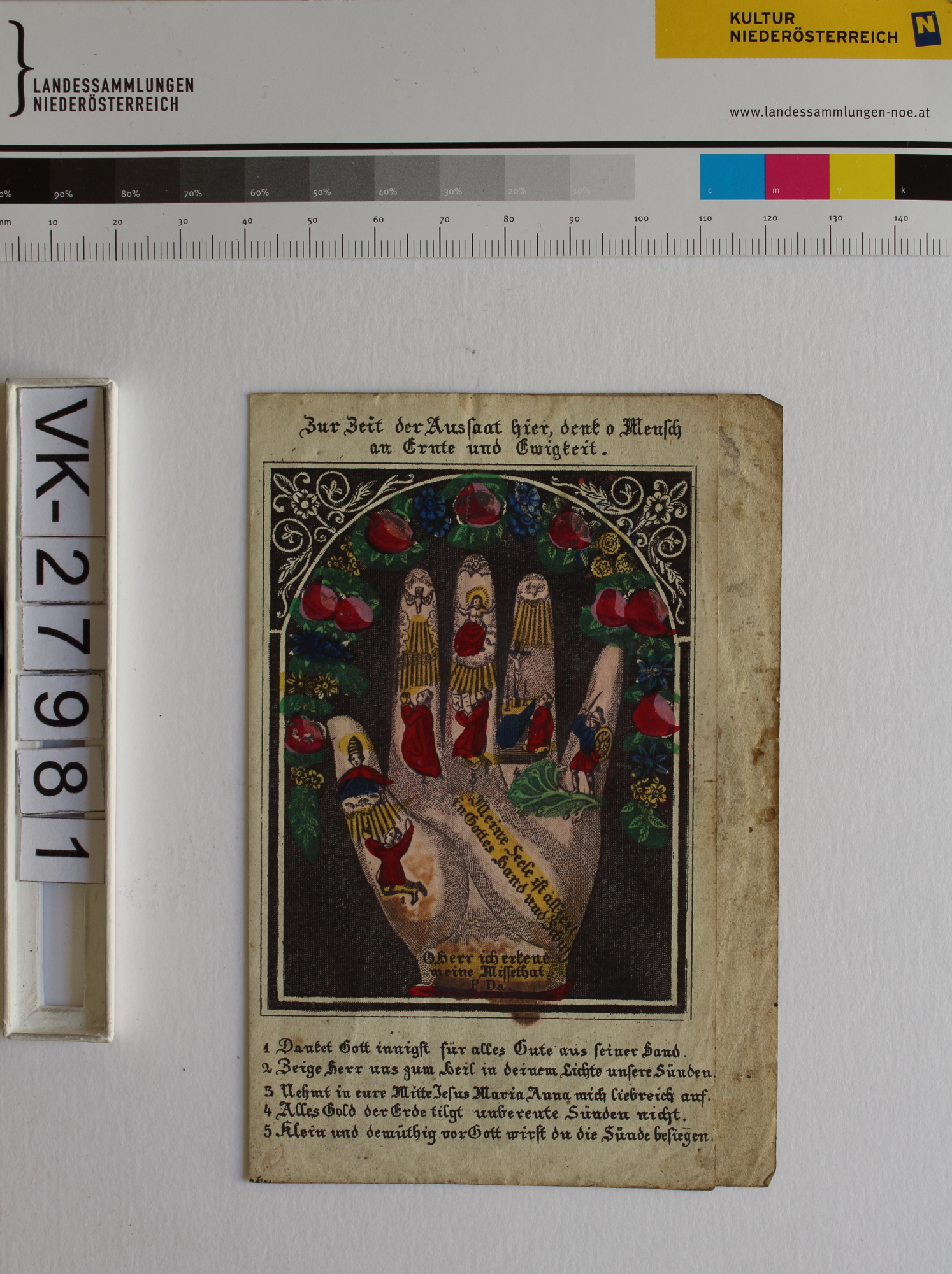 Annarotte, Annaberg, St. Anna Wallfahrtskirche; gefaltet; Vorderseite: Heilige Hand = Annahand mit 5 Sprüchen und dazu gehörigen figuralen Darstellungen; Rückseite: Gnadenstatue = Anna Selbtritt = Anna Maria Jesus, "Jesus, Maria und Anna wie sie auf dem heil. Annaberge auf dem Hochaltare verehrt werden", "Gebet zur heiligen Mutter Anna", "St. Pölten b. J. Nowohradsky" (beschnitten)