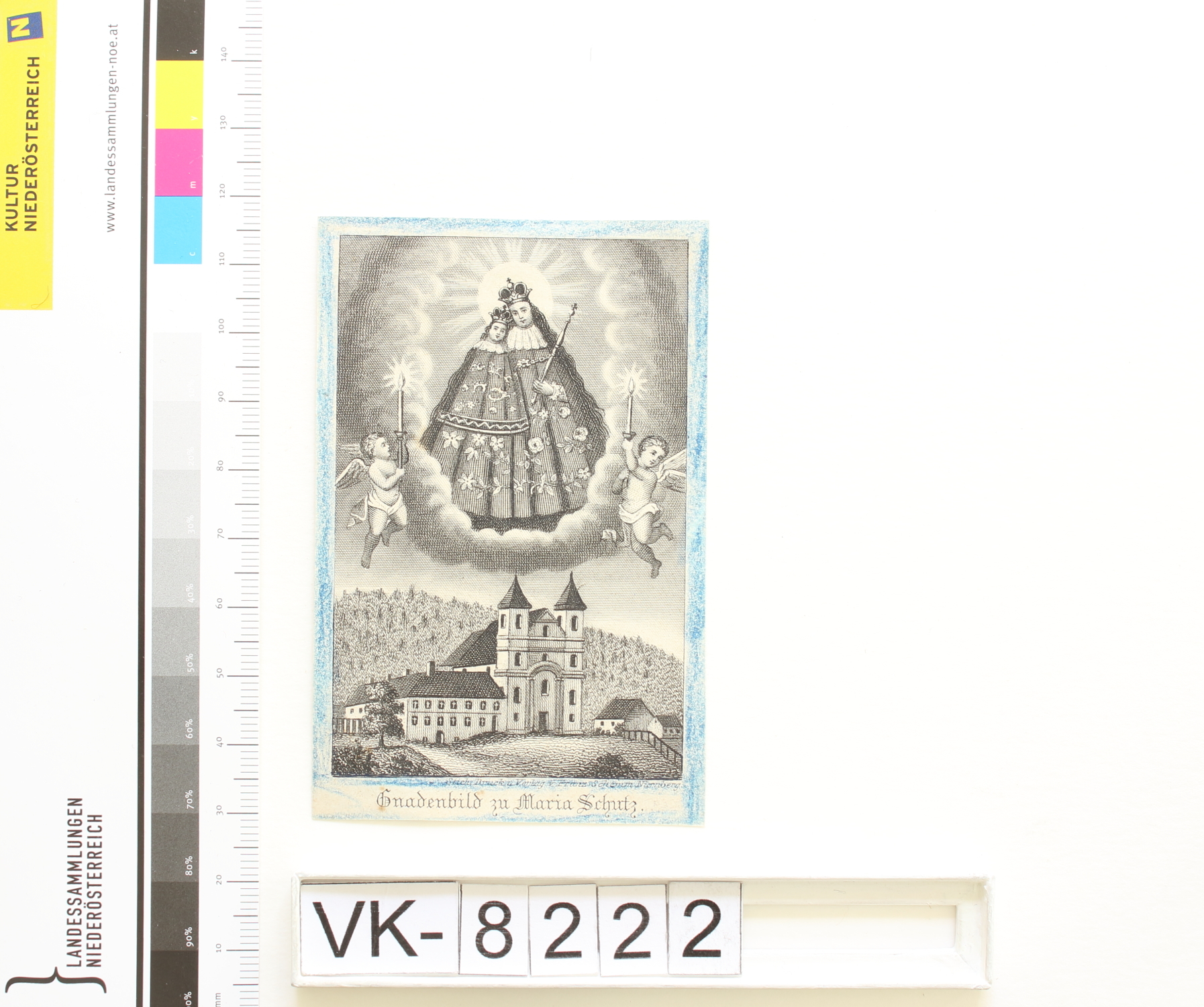 Schottwien, "Maria Schutz" im Semmeringgebiet; Vorderseite: Gnadenbild = Maria mit Kind, Wallfahrtskirche, Engel, "Gnadenbild zu Maria Schutz"; Rückseite: "Gebet zur Mutter Gottes", "Franz Schemm Nürnberg"; Eintrag Inventarbuch: Gebetszettel, Slg. Klar.
