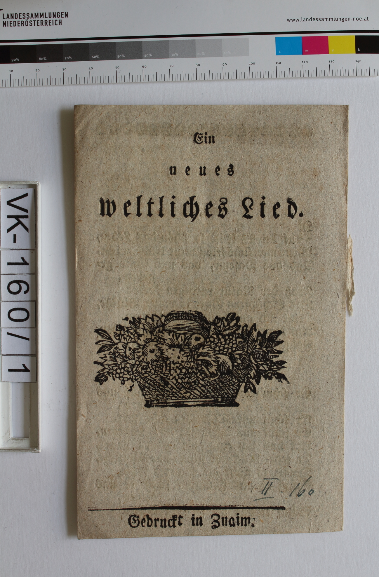 Weltliche Lieder; 1 Blatt, gefaltet: "Ein neues weltliches Lied/ Auf der Welt ist so schön das Leben...", "gedruckt in Znaim", Abbildung: Korb mit Früchten; Eintrag Inventarbuch: "24 Lieder (einzelne Heftchen)"; Bemerkung Klein: 26 überschrieben mit 24