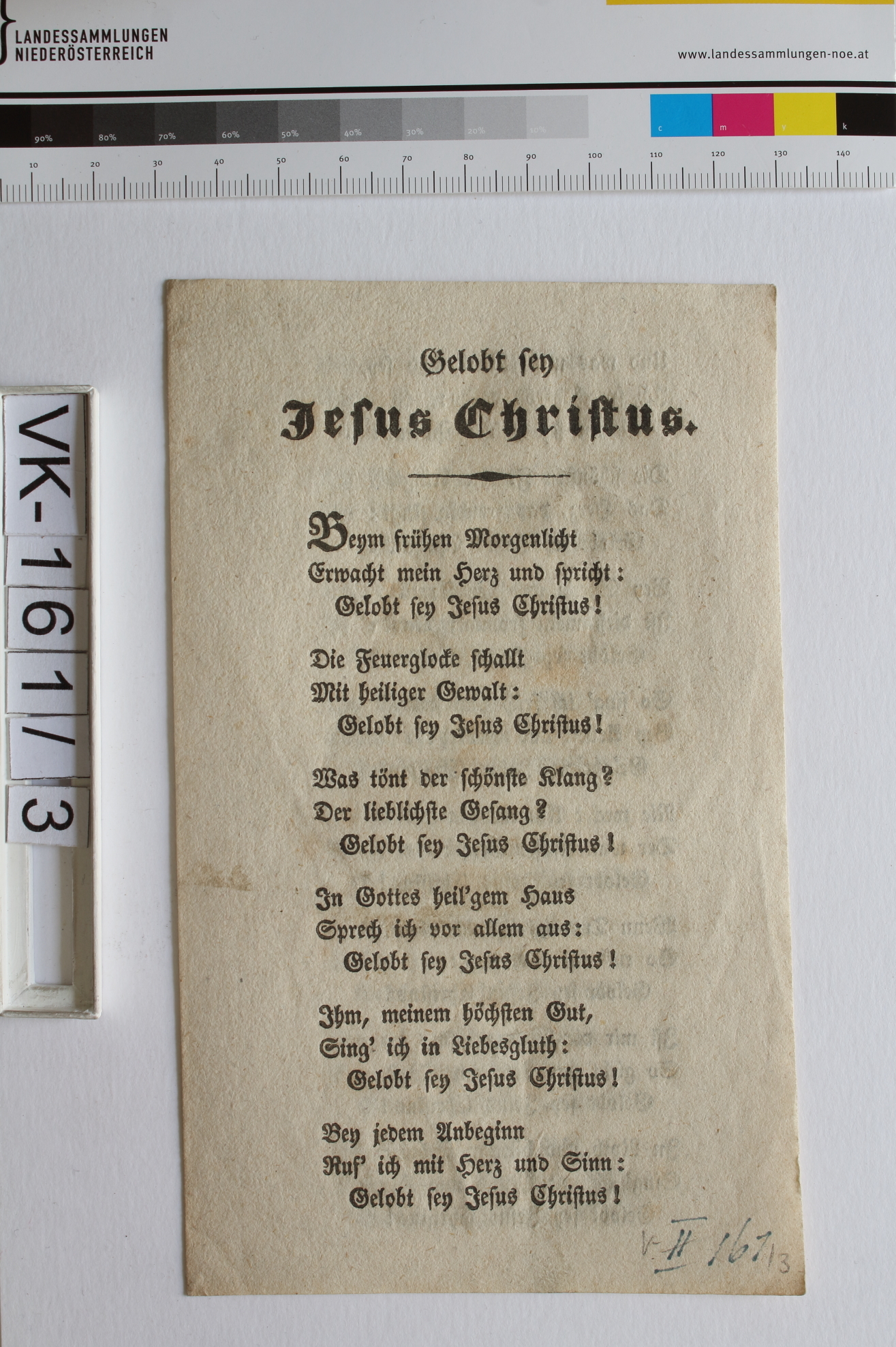Lieder zu Jesus; 1 Blatt, gefaltet: "Gelobt sey Jesus Christus"; Eintrag Inventarbuch: "Lieder zu Jesus etc. (in einem Umschlag"