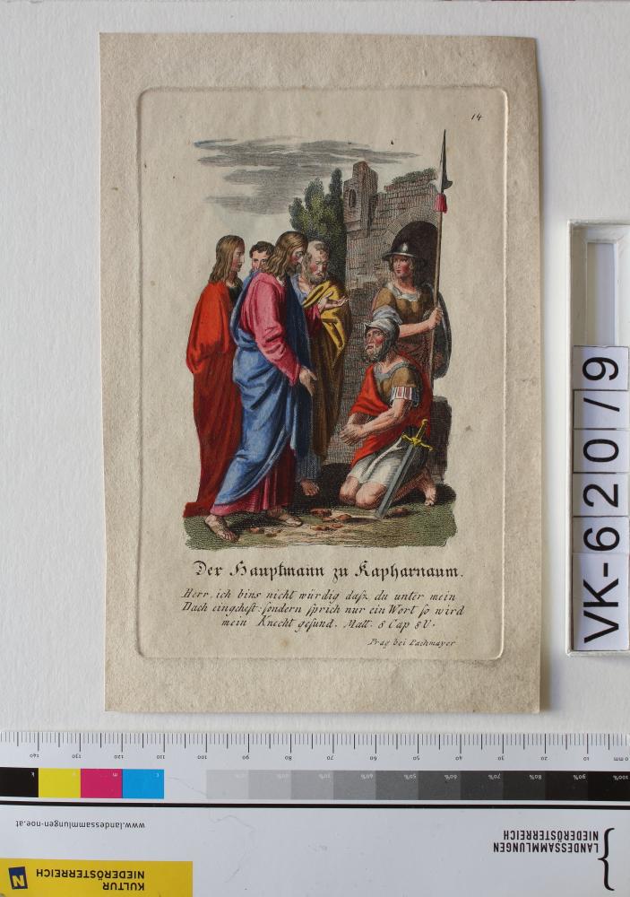 Altes Testament; Vorderseite: Jesus heilt den Diener eines Hauptmannes "Der Hauptmann zu Kapharnaum. Herr ich bin nicht würdig……Matt. 8 Cap. 8 V", "Prag bei Pachmayer"; Eintrag Inventarbuch: "Darstellungen alttest. Bildchen"