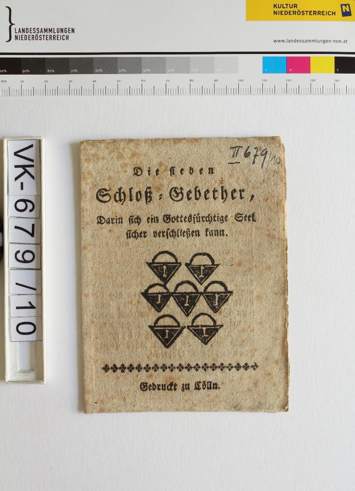 Schloßgebeter; 2 Blatt, gefaltet: "Die sieben Schloß=Gebethr, darin sich ein Gottesfürchtige Seel sicher verschließen kann", "gedruckt in Lolln(?)", Abbildung: 7 Schlösser; Eintrag Inventarbuch: "7 Himmelsriegeln und 7 Schloßgebeter"