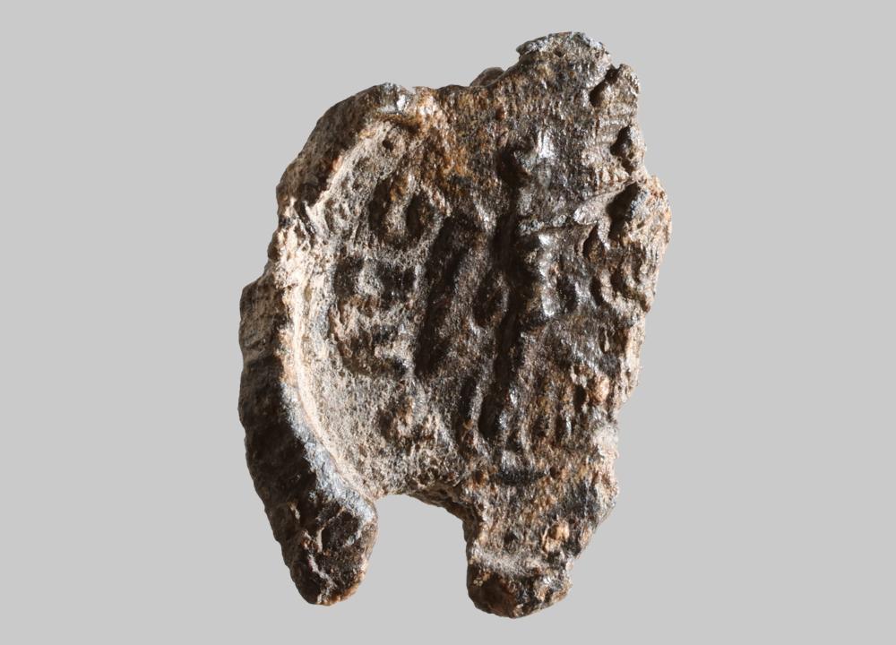 Unförmige flache Plombe mit rundem Stempel. Plombe nicht vollständig ausgegossen, nur linker Teil vom Stempel geprägt. Victoria im Profil nach rechts, Beine im Ausfallschritt, dazwischen Gewandfalten, Gewand im Hüftbereich gegürtet und vorne gebauscht, auf der linken Seite angezogene Flügel, auf der rechten Seite Arme vor sich ausgestreckt. Am linken Feldrand Umschrift [AΛGG…] erhalten. Senktrechte Durchlochung durch Schnurführung. Auf der Rückseite Abdruck von drei parallel erhabenen Linien erkennbar.