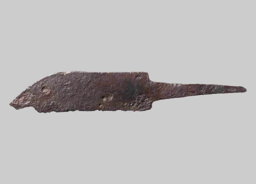 Messer mit fragmentierter, mittelständiger Griffangel und gebogenem Rücken. Die abgesetzte Klinge und Spitze sind abgebrochen.