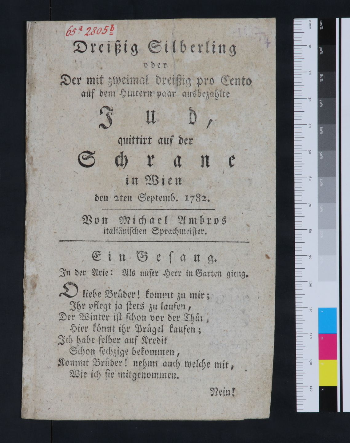„Dreißig Silberling oder Der mit zweimal dreißig pro Cento auf dem Hintern paar ausbezahlte Jud, quittiert auf der Schrane in Wien den 2ten Septemb. 1782. Von Michael Ambros italiaenischen Sprachmeister.“