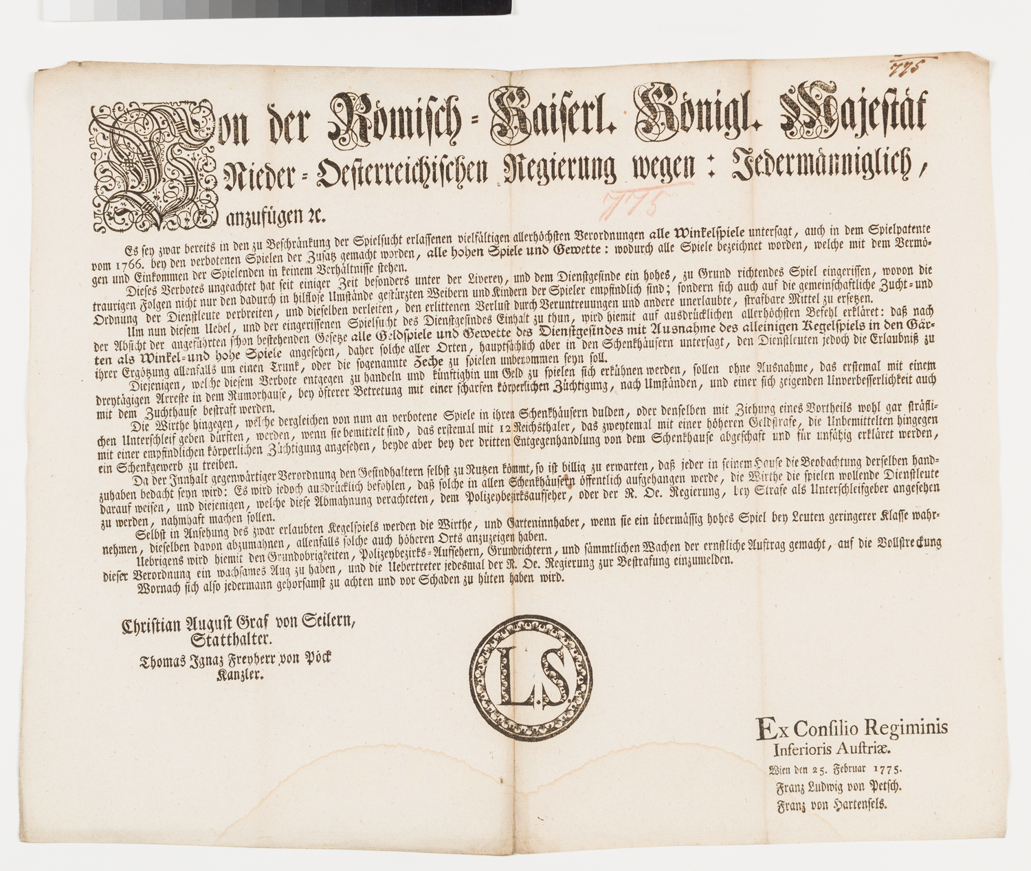 Maria Theresia verkündet in Niederösterreich zur Beschränkung der Spielsucht und der häufig im Dienstgesinde auftrettenden Verschuldung das Verbot aller hohen Spiele, Gewette und Winkelspiele und stellt diese mit kleineren Ausnahmen unter Strafe