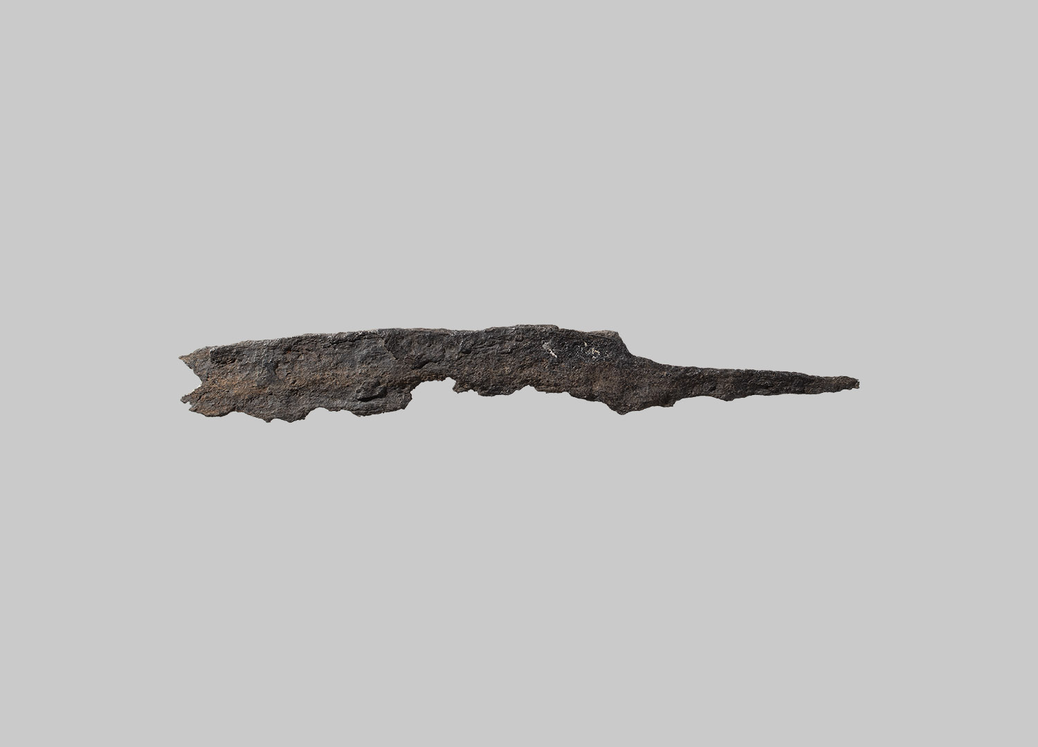 Messer mit fragmentierter, mittelständiger Griffangel und gebogenem Rücken. Die abgesetzte Klinge und Spitze sind abgebrochen.