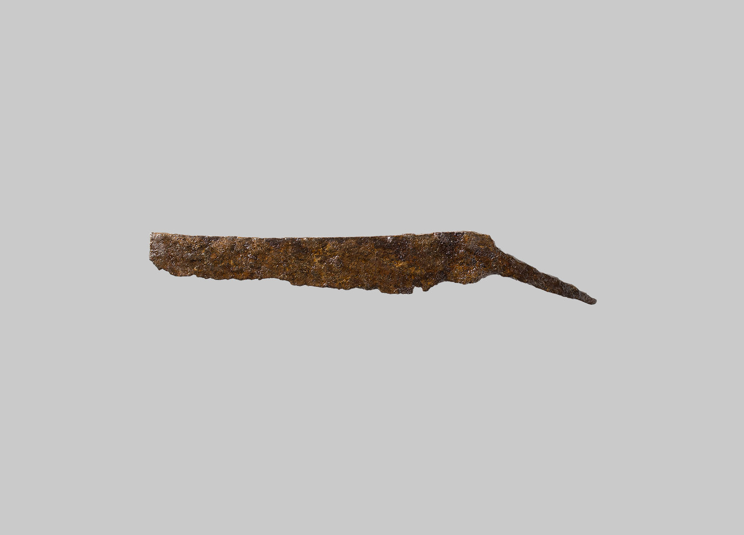 Messer mit kurzer, gebogener, mittelständiger Griffangel und leicht geschwungenem Rücken. Die Schneide und Spitze sind abgebrochen.