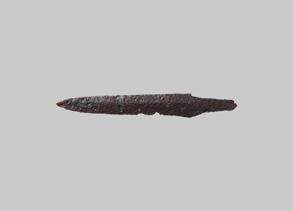 Messer mit fragmentiertem, breitem, flachem, mittelständigem Griff und gebogenem Rücken. Die Schneide und Spitze sind abgebrochen.