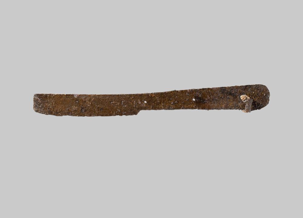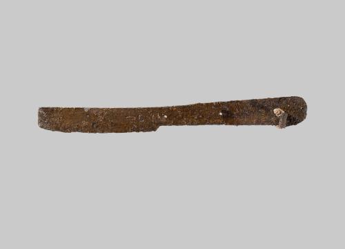 Messer mit leicht geschwungenem Rücken, fragmentierter Klinge mit zwei Punzen und oval abgeschlossenem Griff mit drei Nietlöchern, von denen sich eines in der einseitigen Leiste befindet und einer Hohlniete. Die Spitze ist abgebrochen.