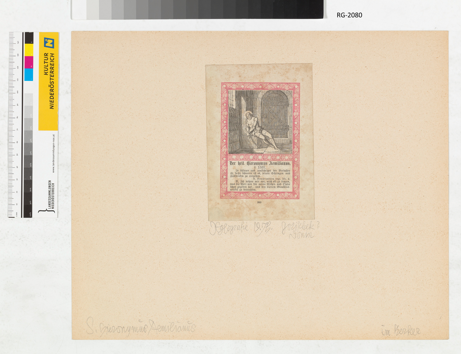 Gebetszettel des heiligen Hieronymus Ämiliani im Kerker; rückseitige Beschreibung seines Lebens.