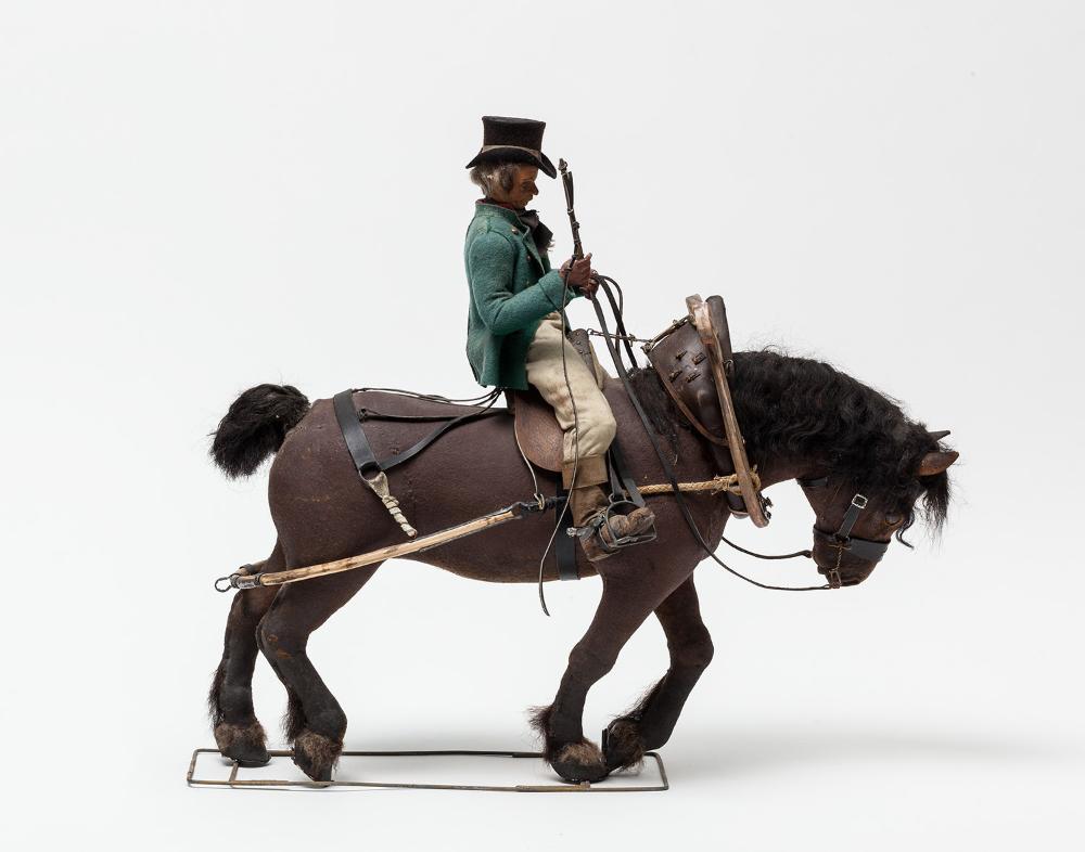 Reiter im grünen Frack mit Zylinder und Peitsche auf braunem Pferd.