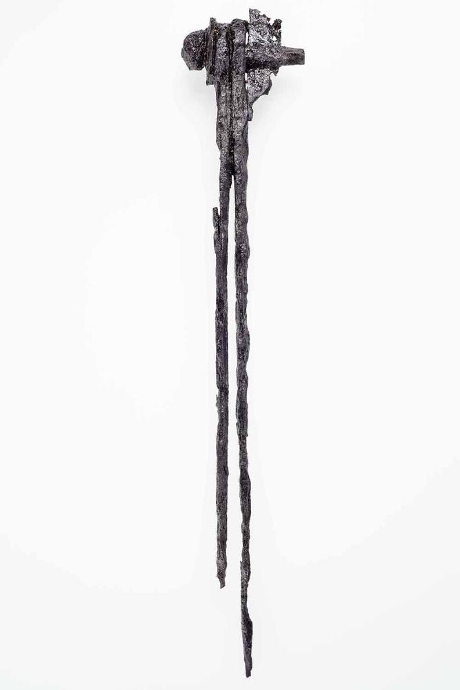 Filigraner, aufwendig gearbeiteter Stechzirkel. Die schmalen, mäßig gekrümmten Schenkel sind zu drei Viertel mit Einkerbungen verziert, die oberen gerundeten Abschlüsse sind gezahnt. Als Gelenk fungiert ein Bronzenagel mit konischem, strahlenförmig gekerbtem Kopf. Im Schlitz des Nagelstiftes steckt ein schmaler Keil, in dessen Oberfläche beidseitig ein X eingemeißelt wurde.