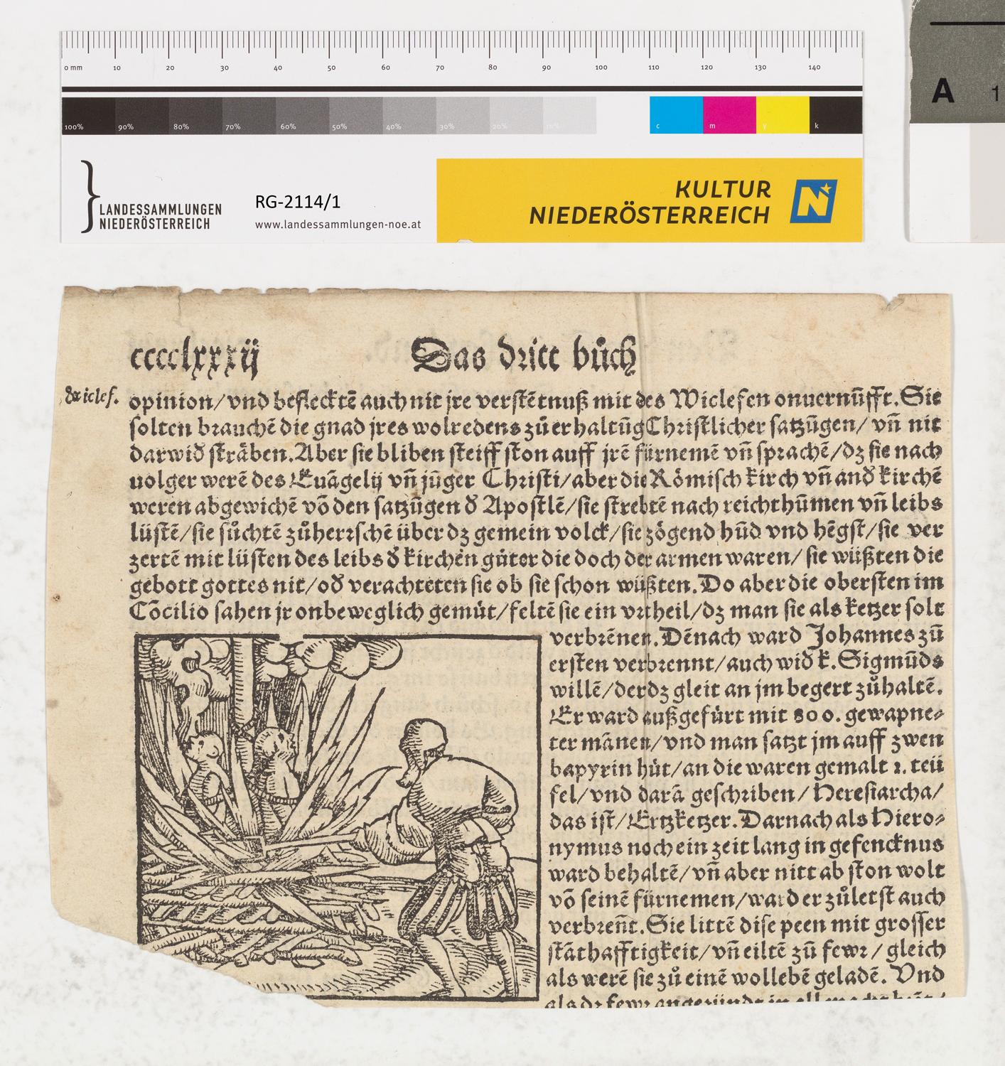 Auschnitt mit Holzschnitt der Verbrennung von Jan Hus und Hieronymus von Prag; Beschreibung des Konzils im Jahr 1414. Aus der Cosmographia von Sebastian Münster; Seite "cccclrry".