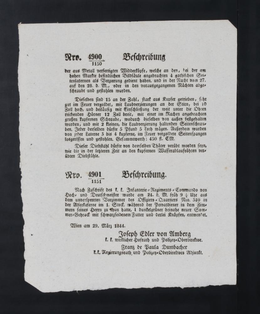 Personenbeschreibungen - "Wien am 29. März 1844. Joseph Edler vom Amberg k.k. wirklicher Hofrath und Polizey=Oberdirektor. Franz de Paula Dumbacher. k.k. Regierungsrath und Polizey=Oberdirektors Adjunkt."