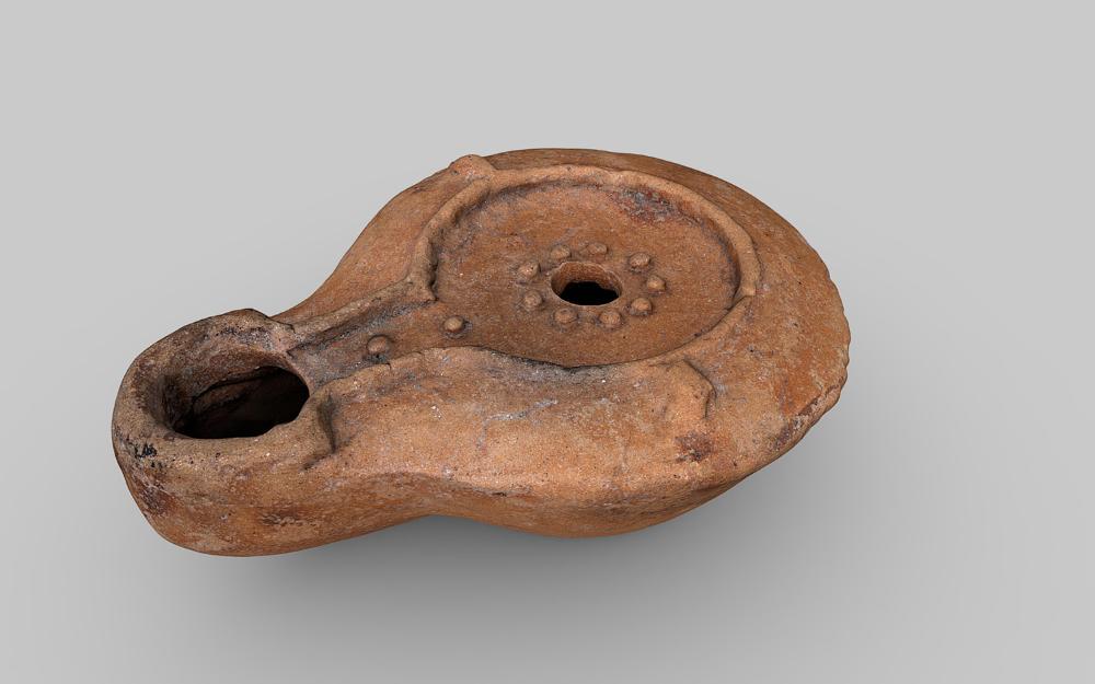 Zwei stegartige Knuppen. Um das Eingussloch ein Kranz aus neun erhabenen Punkten. Im breiten, geraden Kanal zwei erhabene Punkte. Schräge Wandung, doppelter Standring. Überzug stellenweise abgerieben.