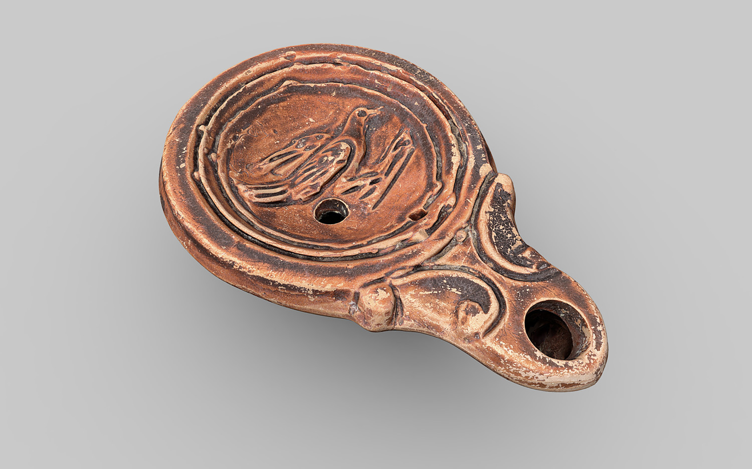 Auf dem Spiegel scharf umrissenes Relief mit deutlicher Innnenzeichnung stellt einen Vogel dar, Gliederung scharf und linear; in den Rillen zwischen den Schulterringen kleine Kügelchen. Eingussloch im linken unteren Feld. Kleines, rundes Luftloch teilweise auf zweitem, teilweise auf drittem Schulterring. Deutliche Standplatte. Auf der ganzen Körper teilweise dicke Überzug.