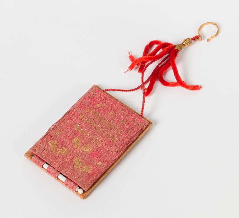 Miniaturheftchen in rotem Einband mit Goldprägung, Rückseite mit Metallelementen, Kaiser Franz Joseph, Linien und Ringe auf braunem Leder, Karton verstärkt. Orange Kordel und Chenillequaste mit goldenem Haken zum Anhängen. Heftchen mit Bleistift verschlossen, Innen gedruckte Tanzfolge in Grün mit eingetragenen Namen in Bleistift.