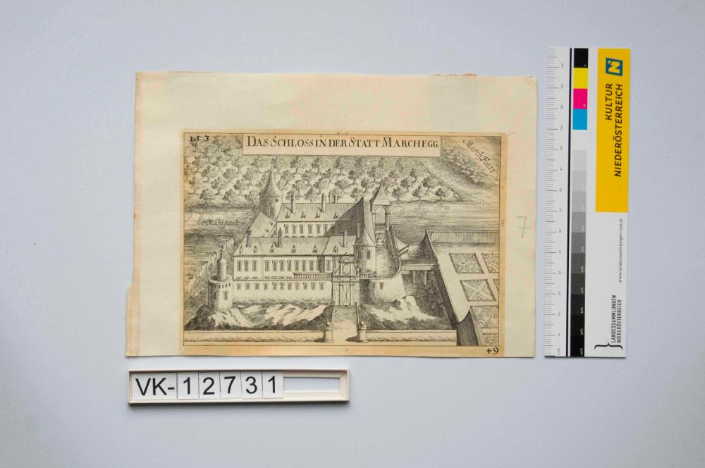 Vischer-Stich mit der Darstellung des Schlosses in Marchegg, Bildtext: "DAS SCHLOSS IN DER STATT MARCHEGG"