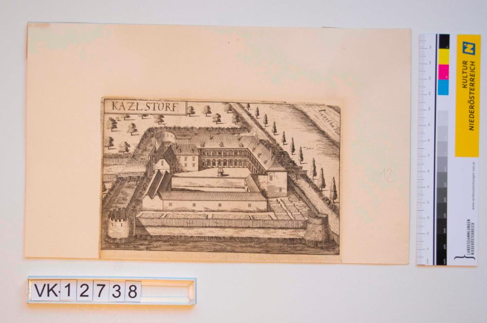 Vischer-Stich mit der Darstellung von Katzelsdorf, Bildtext: "KATZLSTORF"