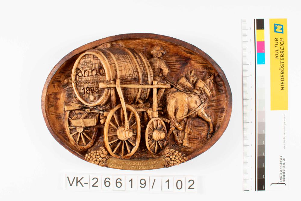 Querovales gegossenes und bemaltes Bild (Holzimitat) als Relief mit Pferdefuhrwerk mit Fass welches die Aufschrift anno 1885 trägt; am unteren Rand Weintrauben und Banner mit der Beschriftung 6. Int. Wandertag 1979 Krems-Hollenburg; rückseitig oben mittig unregelmäßig runde Ausnehmung zum Aufhängen.