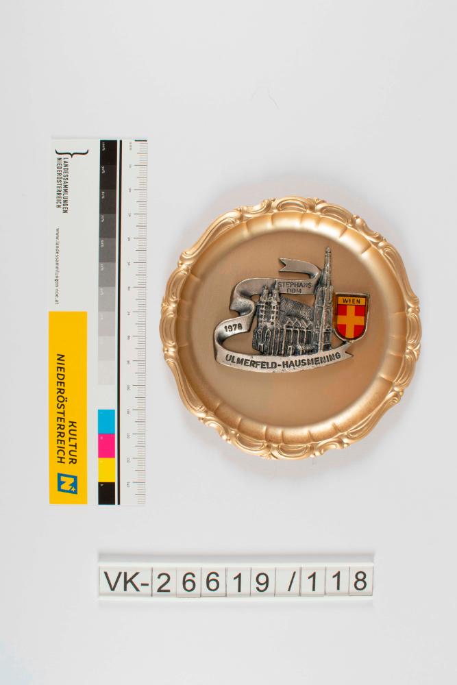Wanderabzeichen in Form eines rankenverzierten Ziertellers aus sehr leichtem Metallblech (Aluminium) in hellgoldener Färbung; mittig aufgeklebt durchbrochenes Relief des Stephansdomes aus schwerem Weißmetall mit umlaufendem Banner mit der Beschriftung Stefansdom 1978 Ulmerfeld-Hausmening und rechts buntes Wappen von Wien; keine Herstellerangaben.