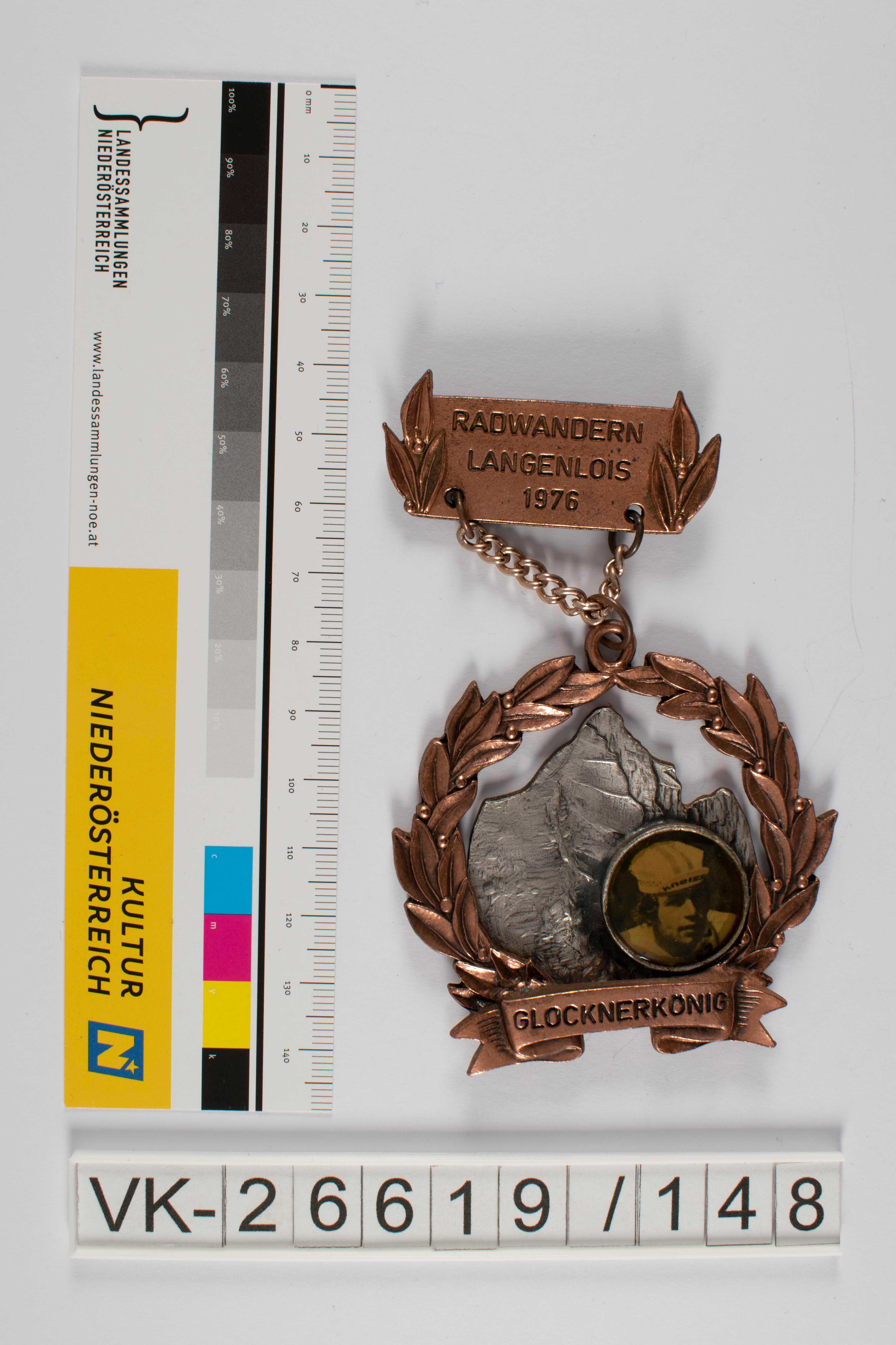 Mehrteilige Wandernadel bestehend aus Anhänger und Nadelkörper welche durch Ringe und Kette miteinander verbunden sind; Anhänger in Form eines bronzenen Lorbeerkranzes mit untenstehendem Banner mit der Aufschrift Glocknerkönig; hinternietet ein silberner Berg und darauf Portrait eines Sportlers als rundes Medaillon geklebt; oben mittig eine runde Öse an welcher eine Kette angebracht ist; Nadelkörper querrechteckig mit Lorbeerblattdekor links und rechts und unten zwei Aufhängelochungen; beschriftet mit Radwandern Langenlois 1976; rückseitig oben angebrachte Nadel mit Gelenk und Sicherheitsverschluss und Herstellerangaben.