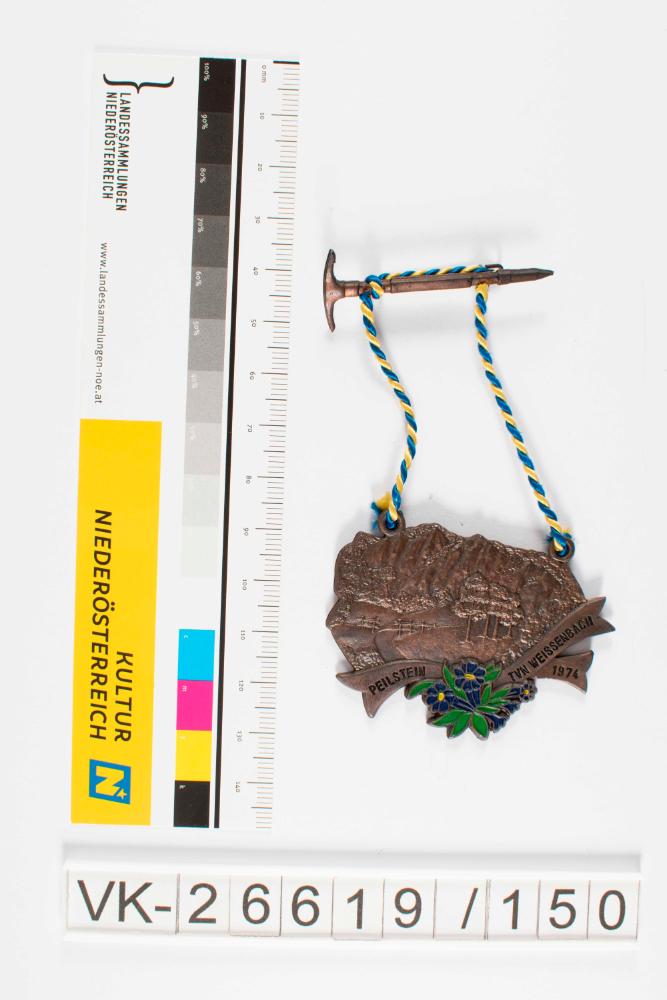 Mehrteilige Wandernadel mit unregelmäßig geformtem Anhänger mit Darstellung einer ländlichen Landschaft mit Weg und Gatter und Bäumen, unten buntes Enzianmotiv und Banner mit der Aufschrift Peilstein TVN Weissenbach 1974; oben links und rechts eine Aufhängeöse durch welche eine blau-gelbe Kordel gefädelt ist; Nadelkörper in Form eines kleinen Pickels, rückseitig Nadel mit spiralförmiger Spannung und U-förmig gebogener Rast.