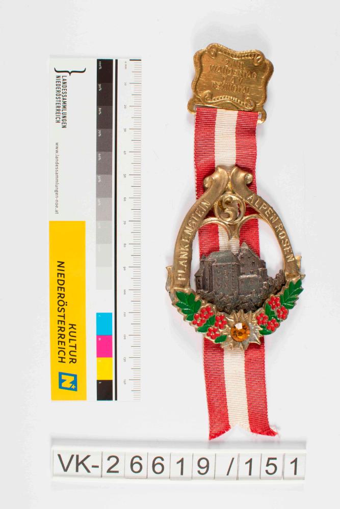 Schwere Wandernadel mit hochovalem, durchbrochenem, goldenem Anhänger mit bunten, emaillierten Blumen unten und einem gelben Kunststoffstein; links und rechts hochziehend Banner mit der Aufschrift Plankenstein Alpenrosen; durch rot-weiß-rotes Band verbunden mit annähernd quadratischem Nadelkörper, durch Rankenmotiv umrahmte Aufschrift 2. Int. Wandertag ÖAV Texingtal; rückseitig Nadel mit spiralförmiger Spannung und U-förmig gebogener Nadelrast.