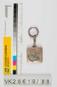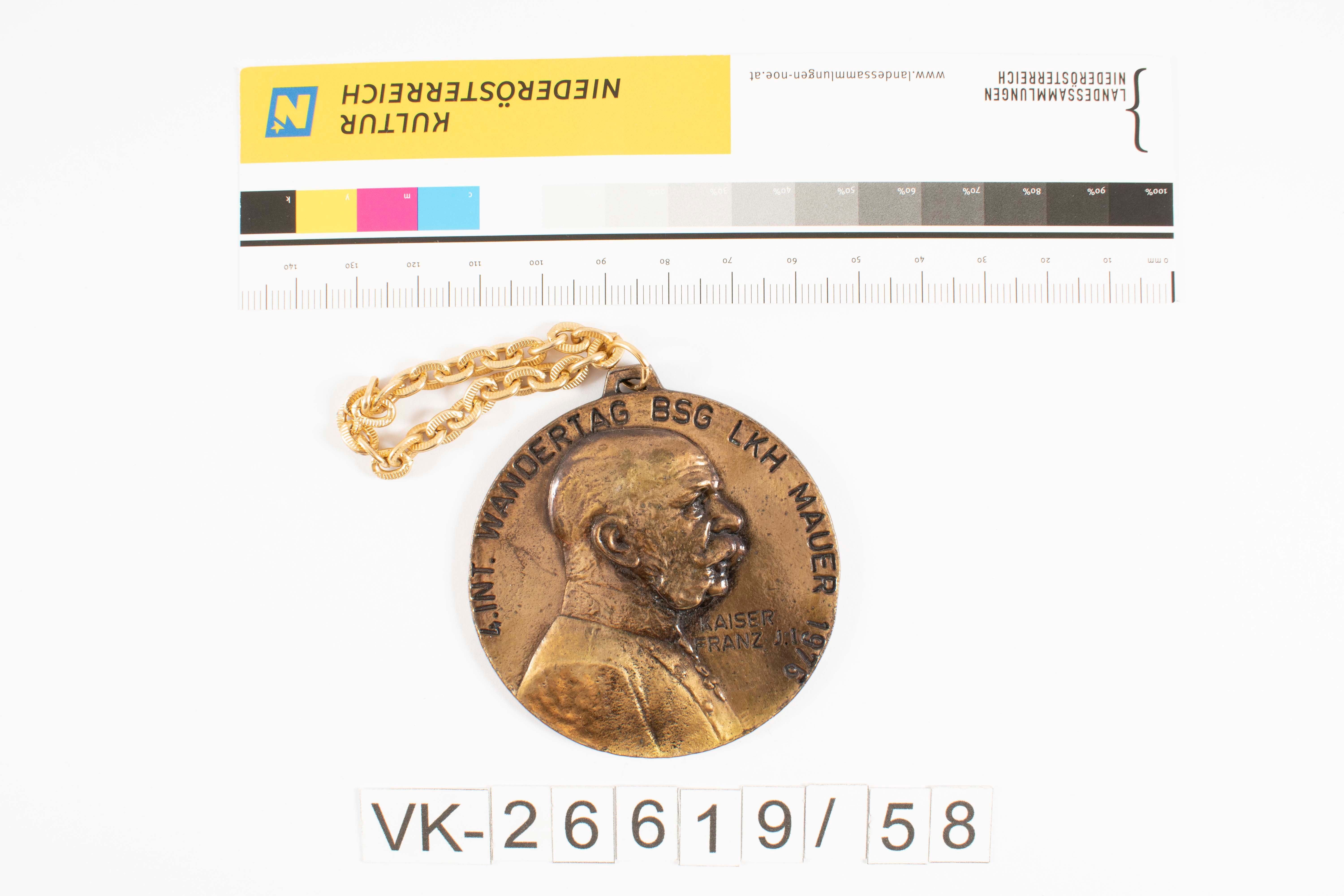 Runde, bronzefarbene Plakette mit goldener Kette; Medaille mit 60 mm Durchmesser mit reliefartig erhabener Abbildung von Kaiser Franz Josef; umlaufende Aufschrift 4. Int. Wandertag BSG LKH Mauer 1976, sowie Kaier Franz J. 1; oben mittig trapezförmige Öse; vielgliedrige Kette aus ovalen, gerillten Gliedern (ca. 110 mm lang) welche mit einem goldenen Ring befestigt ist; hinten deutliche umlaufende Rillen (Bearbeitungsspuren).
