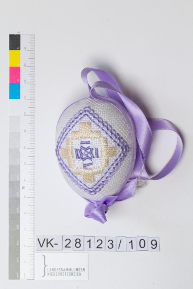 Kunststoffei, umwickelt mit weißem Stoff, bestickt, Musterung: Hardanger-Stickerei in weiß und flieder, Motiv Quadrat, gefüllt; Borte in Flieder (Trennung von Vorderseite und Rückseite) bildet gleichzeitig das Bändchen, verklebt und mit Masche verziert