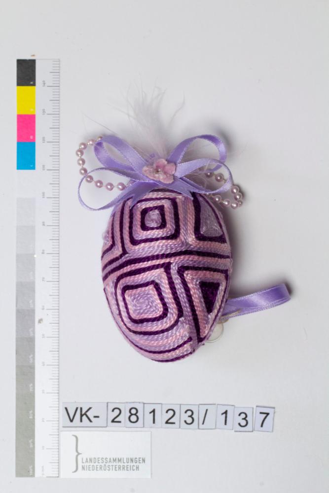 Kunststoffei, Garn (Perlgarn) in violett, rosa und flieder auf Eischale gelegt und verklebt, Musterung: Ornamente (geometrisch); Bändchen: flieder, fixiert mit Masche, verziert mit Blume aus Stoff, Perlenschnur und Feder