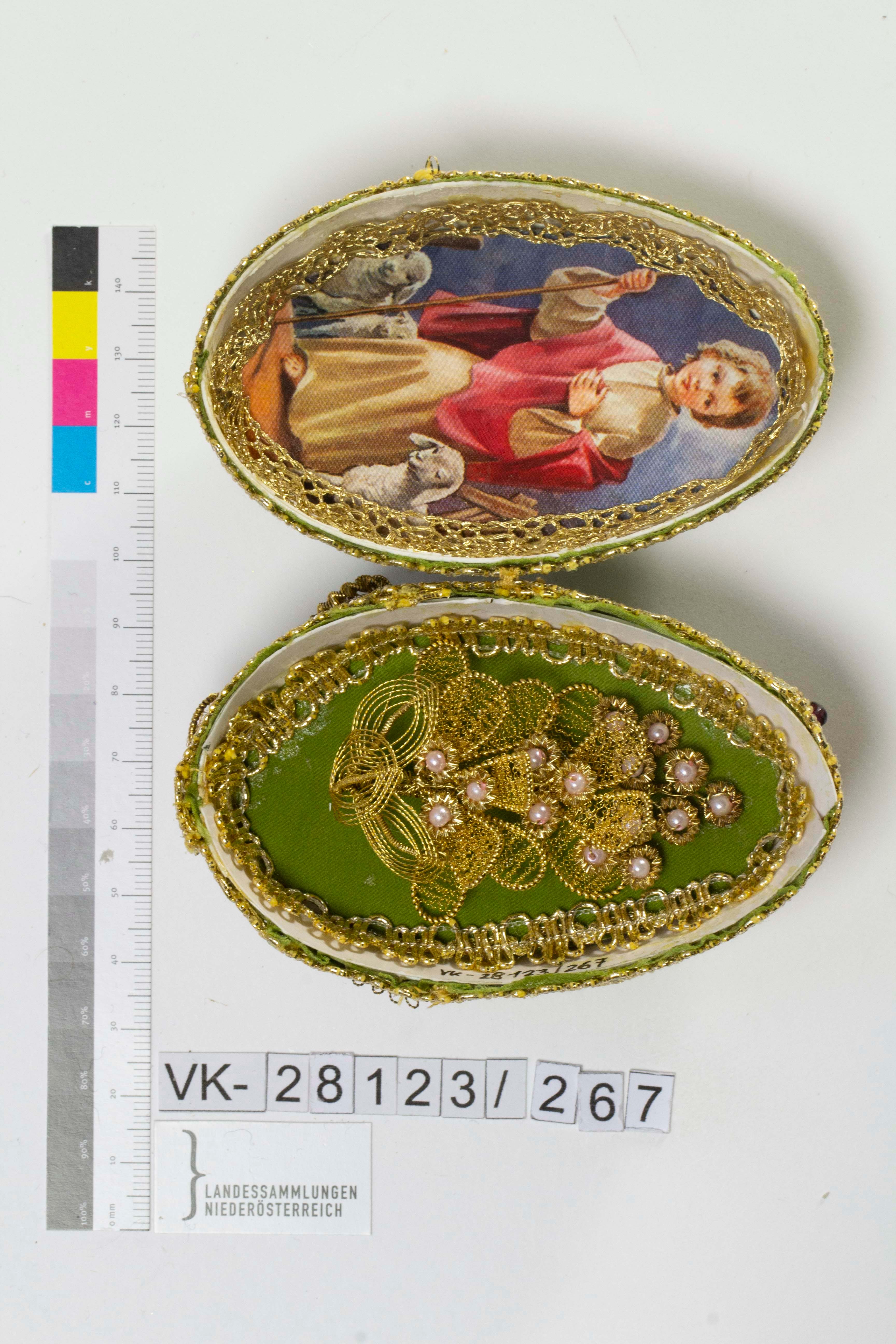 Kartonei, Halbschalenei, aufklappbar: Außenseite mit grünem Satin überzogen, Ränder mit Goldborte verziert, auf Deckel Klosterarbeit mit Gold, Silber, roten Glassteinen und Perlen; Innenseiten: Druckgrafik Jesus (Knabe) als Hirte mit Schafen, Klosterarbeit mit Gold und Perlen auf grünem Satin; alle Ränder mit Goldborten verziert; beide Halbschalen mit Riegel zusammengenäht