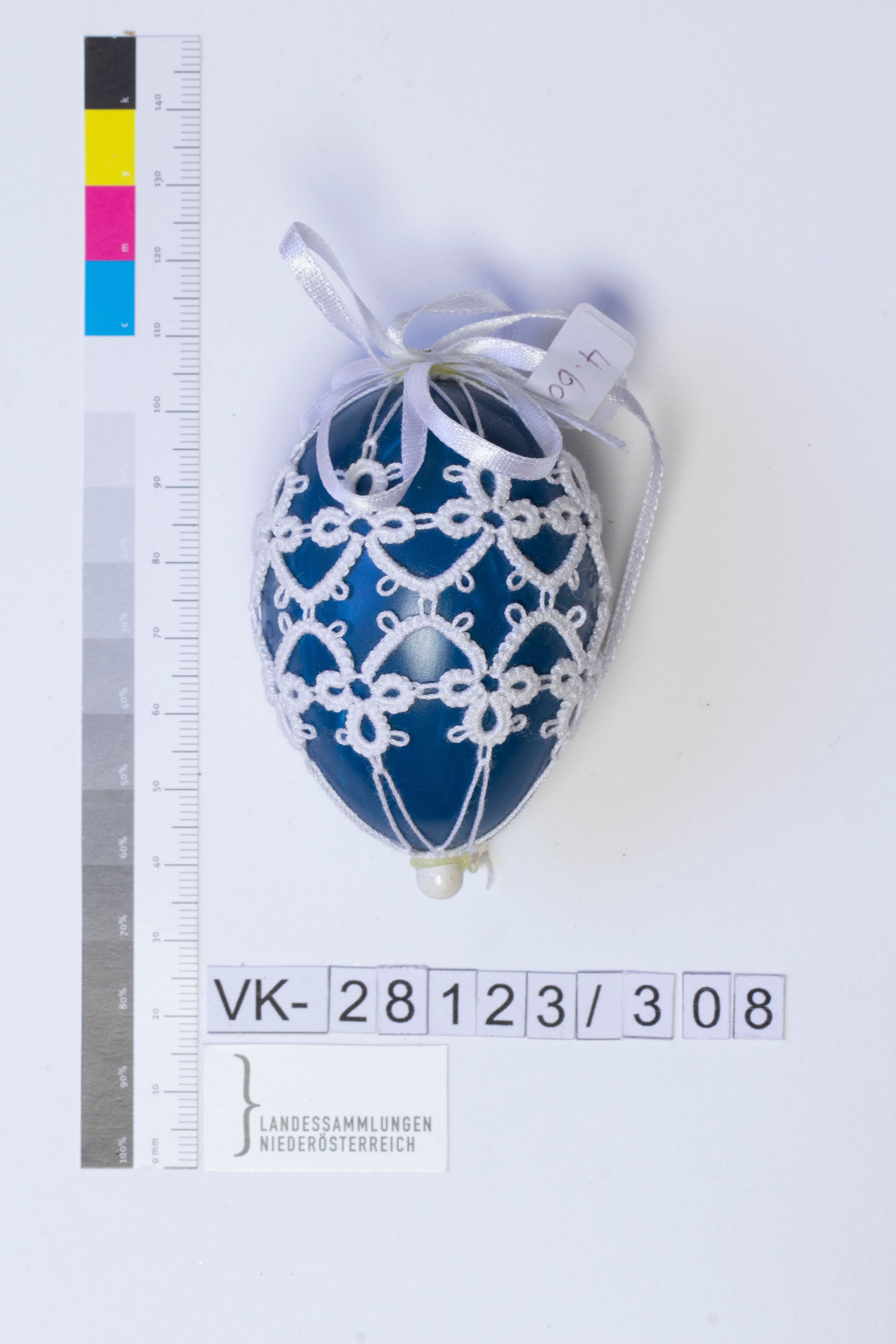 Kunststoffei, türkis bemalt, umwickelt mit Occhispitze aus weißem Garn, Musterung: durchbrochen, Bogen ergeben Blütenornamente; Bändchen: weiß, mit Masche und Holzkugel fixiert, Etikette "4.60"